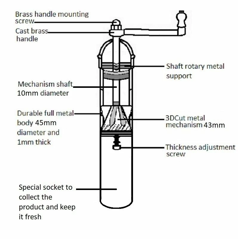 Traditional handmade Alexander Greek Coffee Mill # 004, designed to grind the coffee beans and not just crush them, maximizing the flavour and aroma. The mill is also suitable for all dry and hard spices, except salt.