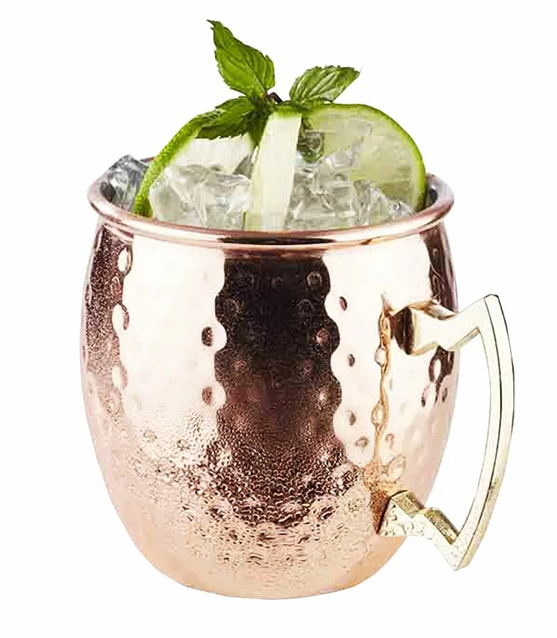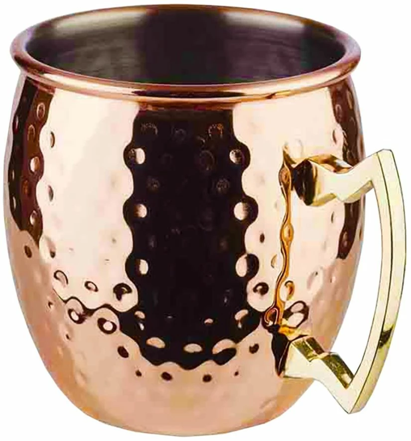 A traditional Moscow Mule barrel mug made of elegantly hammered and copper plated stainless steel.