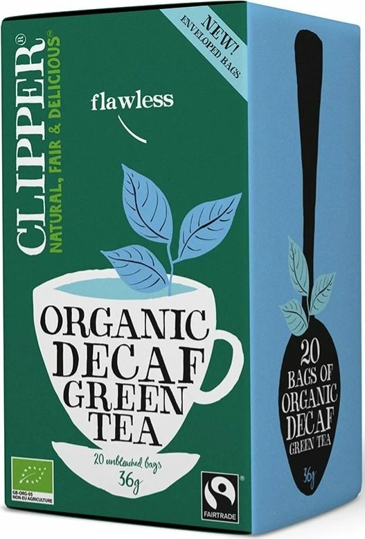 Clipper Organic Decaf Green Tea is a decaffeinated alternative for those who want to enjoy a lighter but flavonoid-rich green tea. The green tea comes from Fairtrade tea plantations in India and China. Blended and packaged at the Clipper tea factory in southern England.