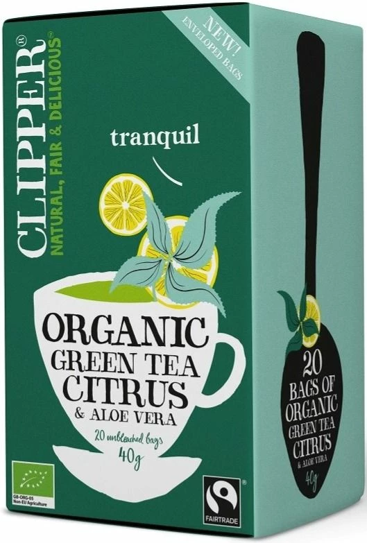 Light refreshing & clean tasting Clipper green tea, subtly infused with aloe vera and deliciously enhanced with the zestly citrus flavour. Blended and packaged at the Clipper tea factory in southern England.