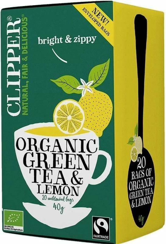 A light, crisp and highly refreshing green tea with a delicious lemony citrus zing. The green tea comes from Fairtrade tea plantations in India and China. Blended and packaged at the Clipper tea factory in southern England.