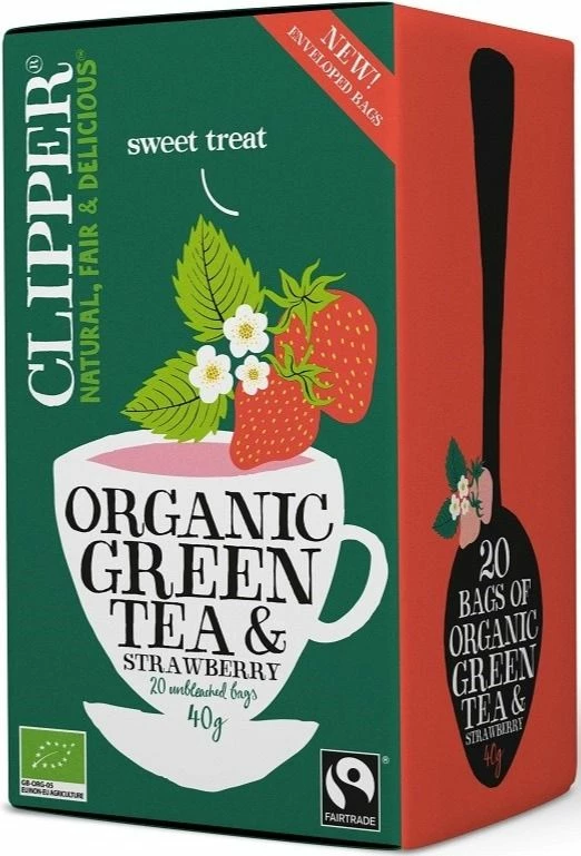 Clipper Organic Green Tea & Strawberry is a blend of Fairtrade certified pure green tea flavored with sweet strawberry. The green tea comes from Fairtrade tea plantations in India and China. Blended and packaged at the Clipper tea factory in southern England.
