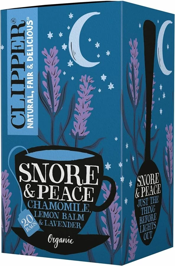 A pleasant and balancing Clipper Snore & Peace herbal infusion blend with tasty chamomile and lavender and a slightly refreshing taste of lemon balm. An ideal calming herbal infusion to enjoy before going to bed. Blended and packaged at the Clipper tea factory in southern England.