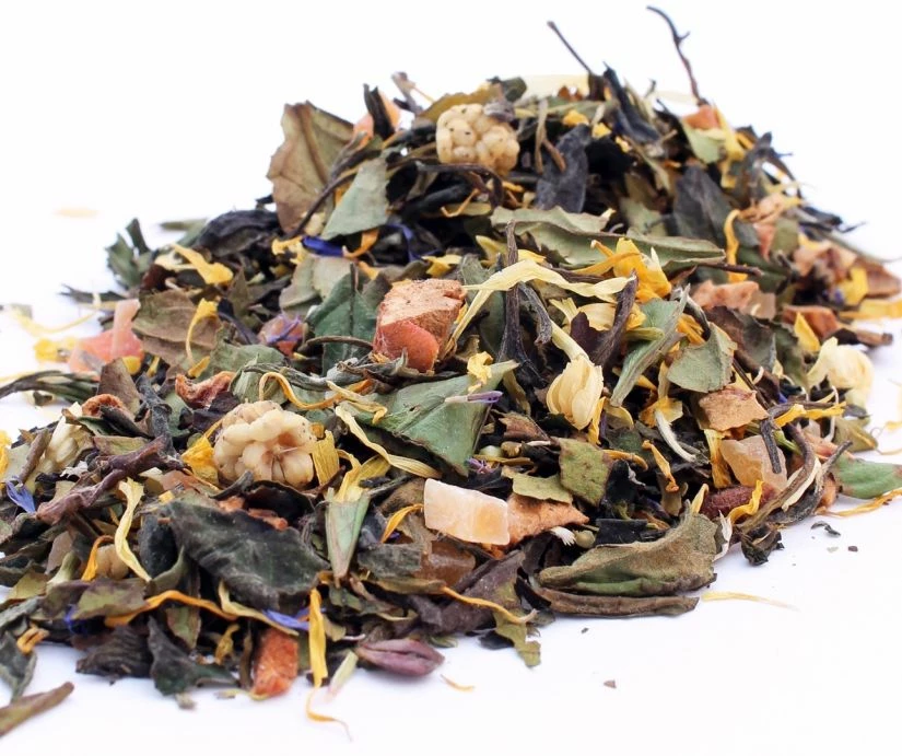 White tea (42%), pieces of papaya (papaya, sugar), apple pieces mulberries 8 %, flavors, marigold, jasmine flowers, flowers.