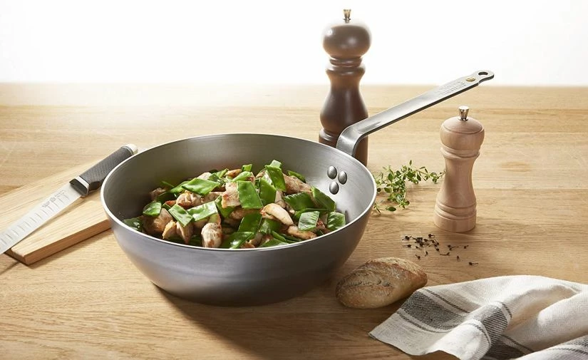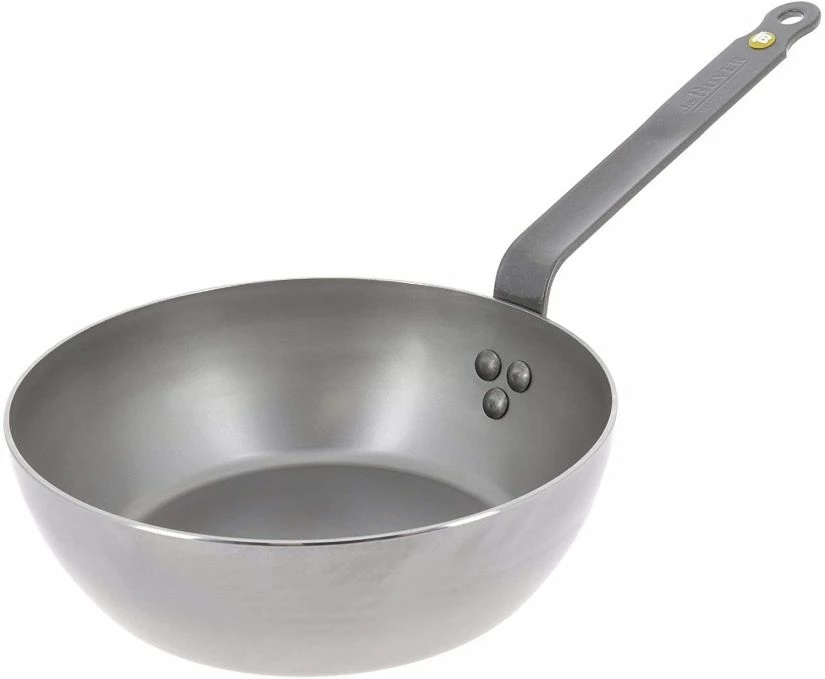 The de Buyer Mineral B Element carbon steel pan is a top-seller. These pans have been made in the same fabric in France since 1830. The carbon-steel pan will last forever and is indestructible. The pan heats up quickly and becomes hot enough to brown the surface. The pan has a riveted, unbreakable iron handle. It’s thickness is 2,5-3mm.