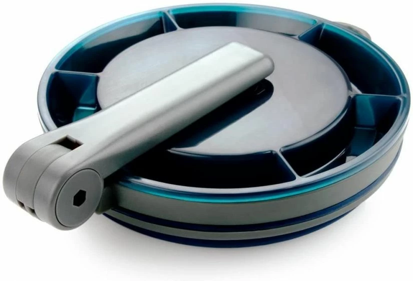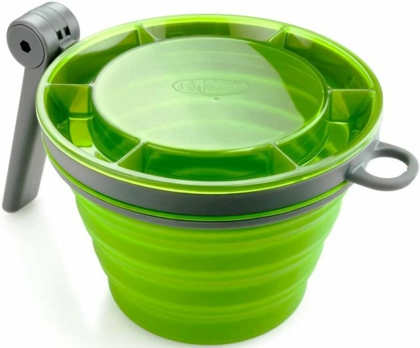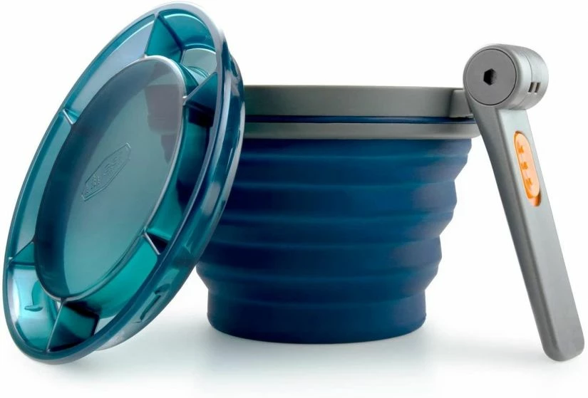 GSI Outdoor original Fairshare mealtime mug with a folding handle that locks in two places, a collapsible, silicone body which expands from an easy- packing 4.3 cm high to a generous 650 ml capacity.