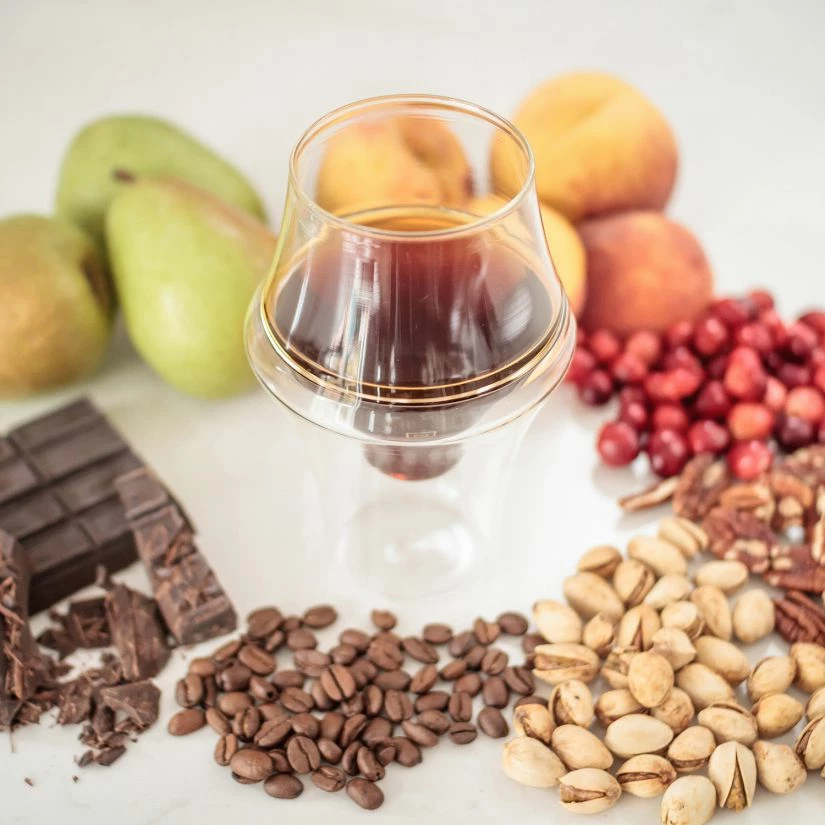 The Kruve EQ EXCITE coffee aroma glass has a unique, bulbous shape and large liquid surface area. Thanks to this, the rate of oxidation is higher, which reduces the acidity and enriches the flavor, while at the same time capturing the aroma. It pairs well with dark roasts, full-bodied with hints of chocolate and nuts.