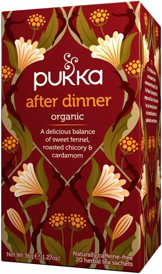 Pukka After DInner is a wonderfully sumptuous tea for soothing digestion after your meal. First, the luxurious taste of roasted chicory. Next, the calm of cardamom mingling with aniseed, followed by sweet fennel and licorice. You’ll find one slow sip following another. It could be the best course of the evening.