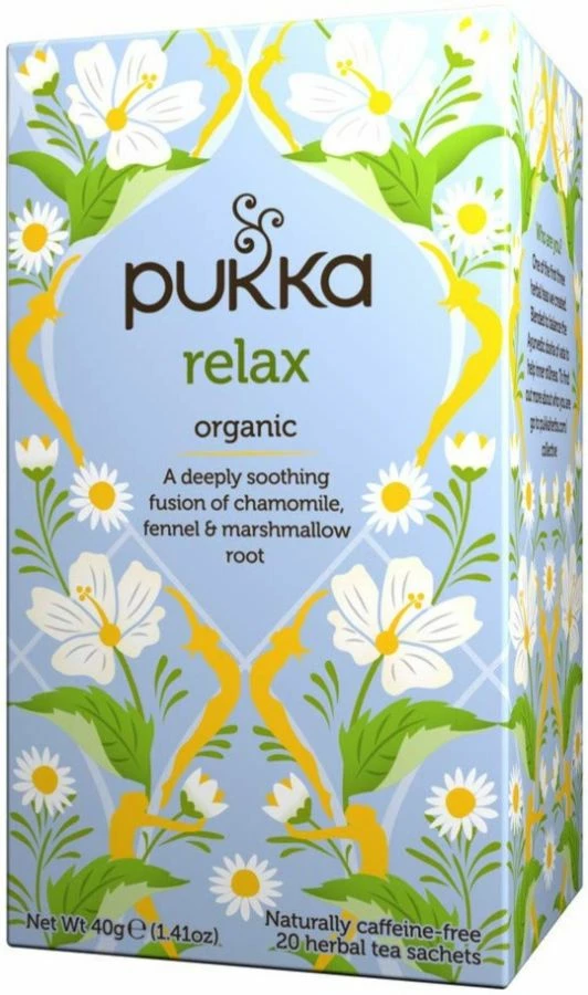 Take a moment to reflect and relax with Pukka Relax. Made with organic chamomile flower to help you to unwind and fennel seed and ginger to ease digestion.
