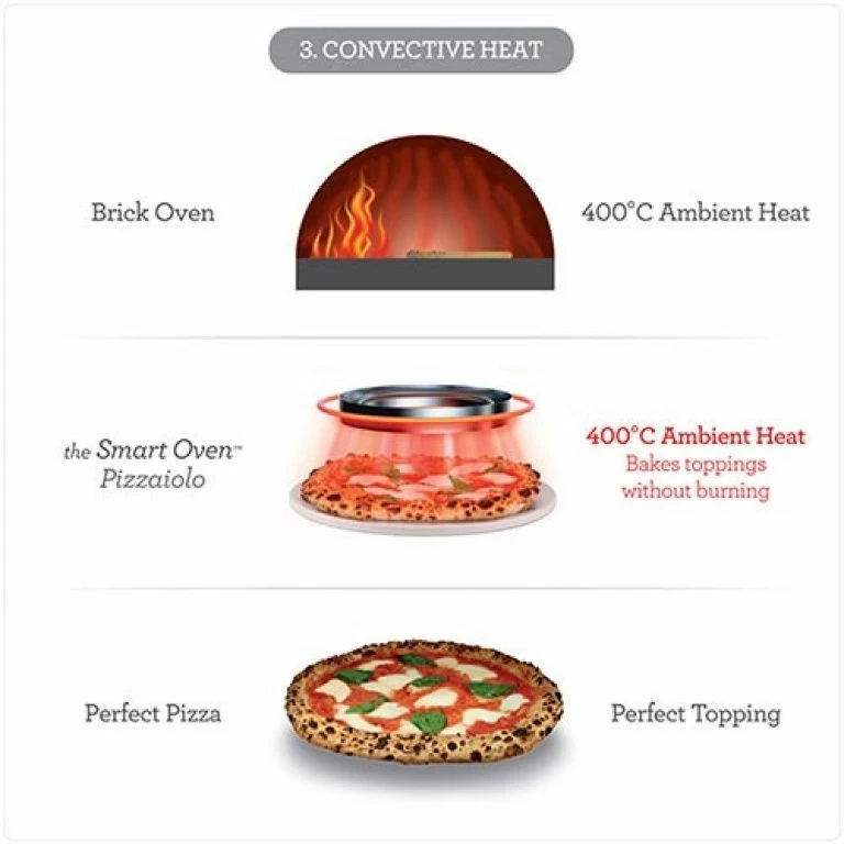 The Sage Smart Oven Pizzaiolo is the first domestic benchtop pizza oven to hit 400°C and cook an authentic wood fired style pizza in just 2 minutes. It replicates the three types of heat generated by a brick oven – conductive, radiant and convective.