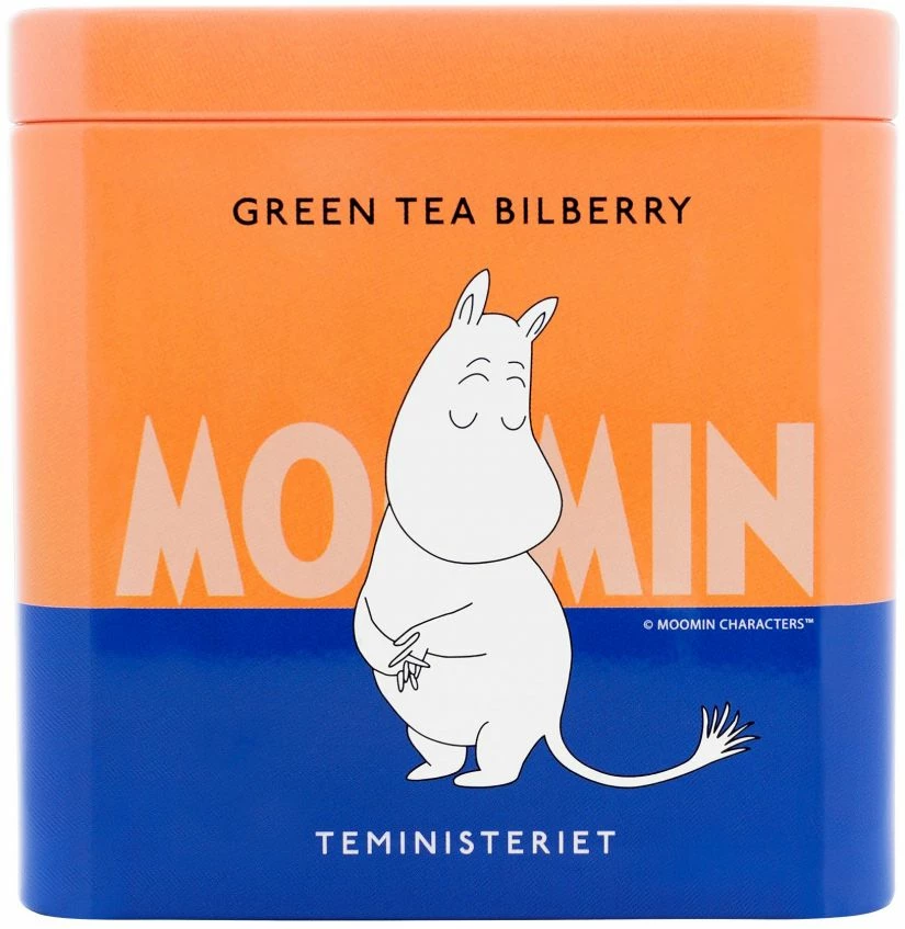 Teministeriet Moomin Green Tea Bilberry, a green tea blend with blueberry taste. The loose tea is packaged in a cute Moomin themed tin box.