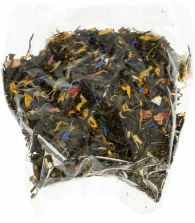 green tea, currants, flavouring, blueberries, cornflower blossom, sunflower blossom, marigold blossom, rose petals.