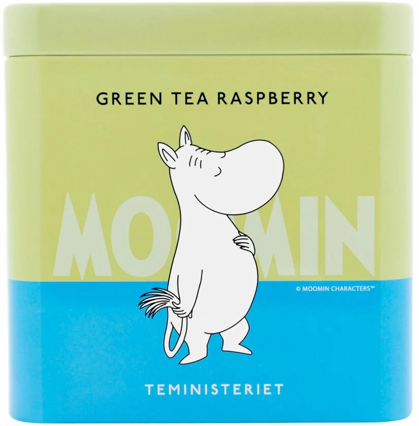 Teministeriet Moomin Green Tea Raspberry, a green tea blend with raspberry taste. The loose tea is packaged in a cute Moomin themed tin box.